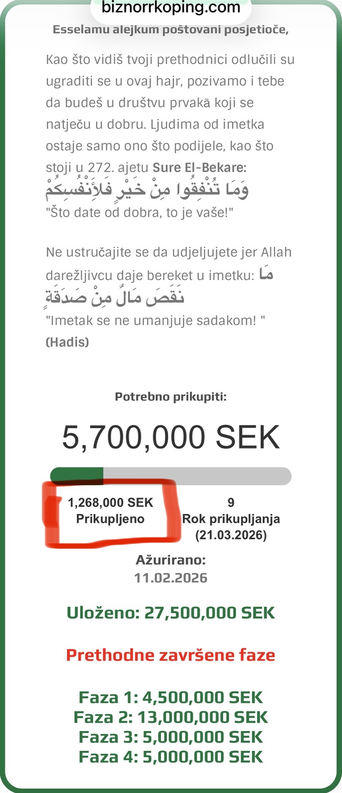 📣 Pozivamo sve koji su u mogućnosti da pomognu svojim prilozima, kako bismo, uz Allahovu pomoć, što prije došli do našeg cilja i završili izgradnju džamije.